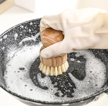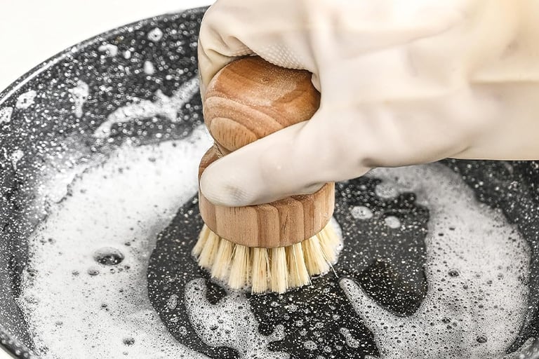 Las esponjas amarillas de toda la vida son, literalmente, trozos de plástico que se van deshaciendo por el desagüe (llegando al mar) y dejando residuos en tus platos. Los cepillos de madera con cerdas de unión o coco limpian con más fuerza, no acumulan olores desagradables y, cuando terminan su vida útil, son totalmente biodegradables. Es el último paso para que tu ciclo de cocina sea 100% circular y libre de tóxicos.