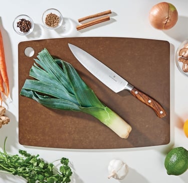 Este es quizás el cambio más impactante. Cada vez que cortas cebolla sobre una tabla de plástico, el cuchillo arranca virutas invisibles de polímeros que terminan en tu sartén. Se estima que ingerimos el equivalente a una tarjeta de crédito en plástico al año, y las tablas son grandes culpables. Las tablas de acero inoxidable 304 son indestructibles, no porosas (cero bacterias) y se limpian con una sola pasada.