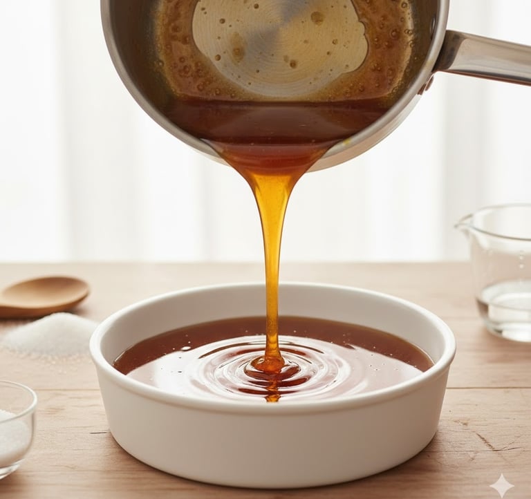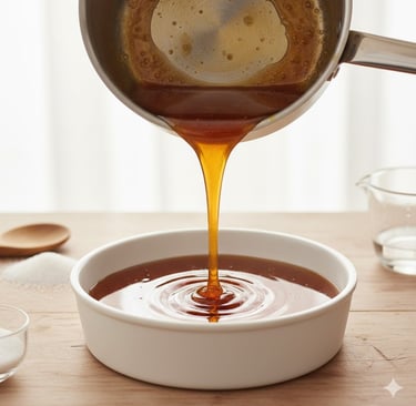 En una sartén, mezcla el azúcar y el agua a fuego medio. ¡No uses espátula! Simplemente gira la sartén hasta que el azúcar se disuelva y adquiera un precioso color ámbar dorado.